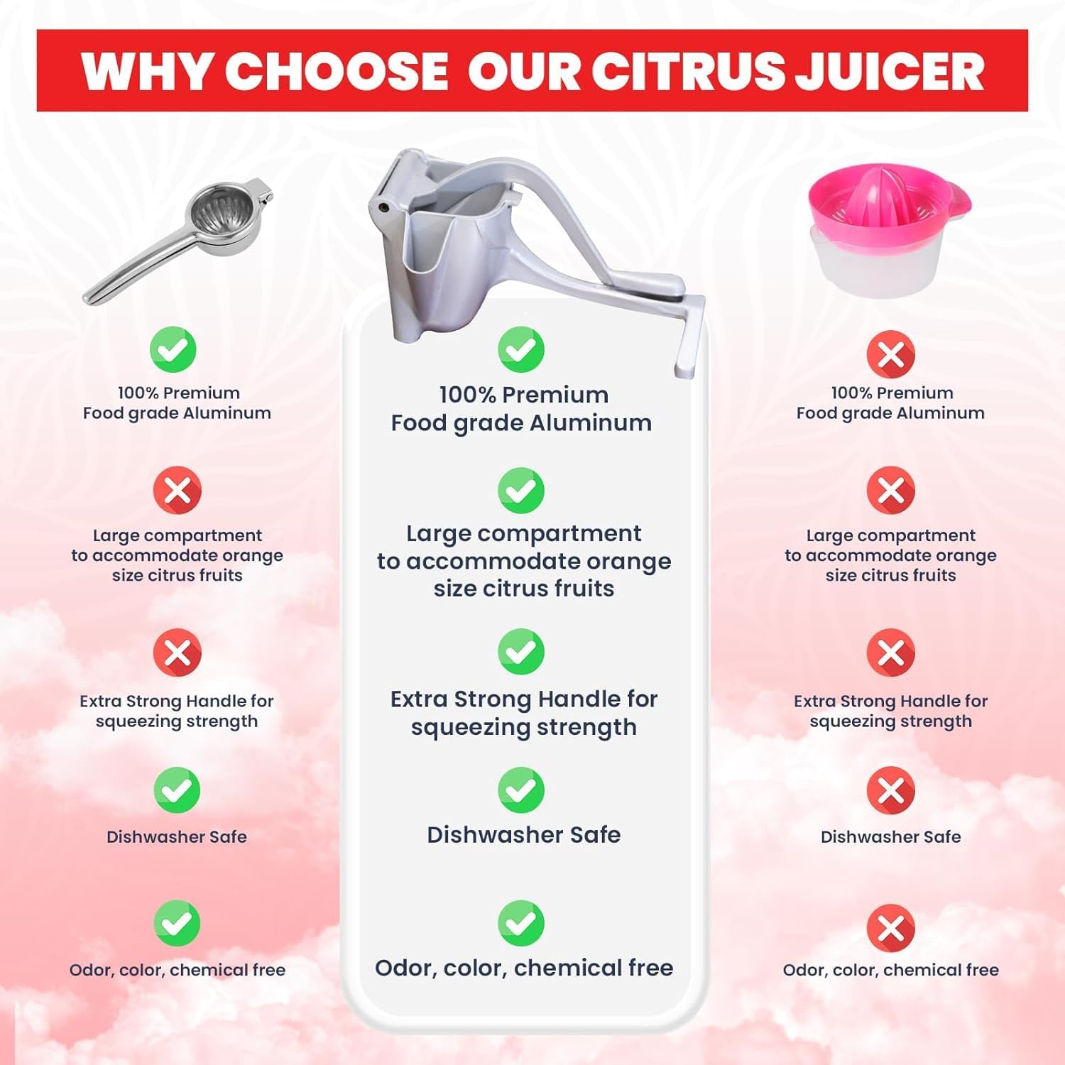 Ergonomic design - Heavy duty alloy body and ergonomic handle. Your hands will never run out of effort when using our strong alloy handles. An easy press, you can be drinking Juice in a just moments.