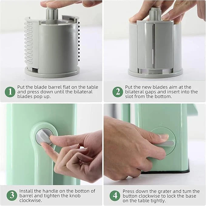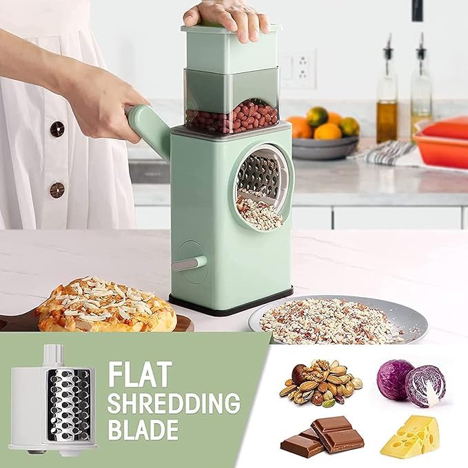 - This vegetable cutter has three vegetable cutting blades, which can slice ingredients and grind peanuts, cheese, etc. With this drum vegetable cutting machine, you can quickly cut the vegetables into the state you need, which will save you a lot of time.